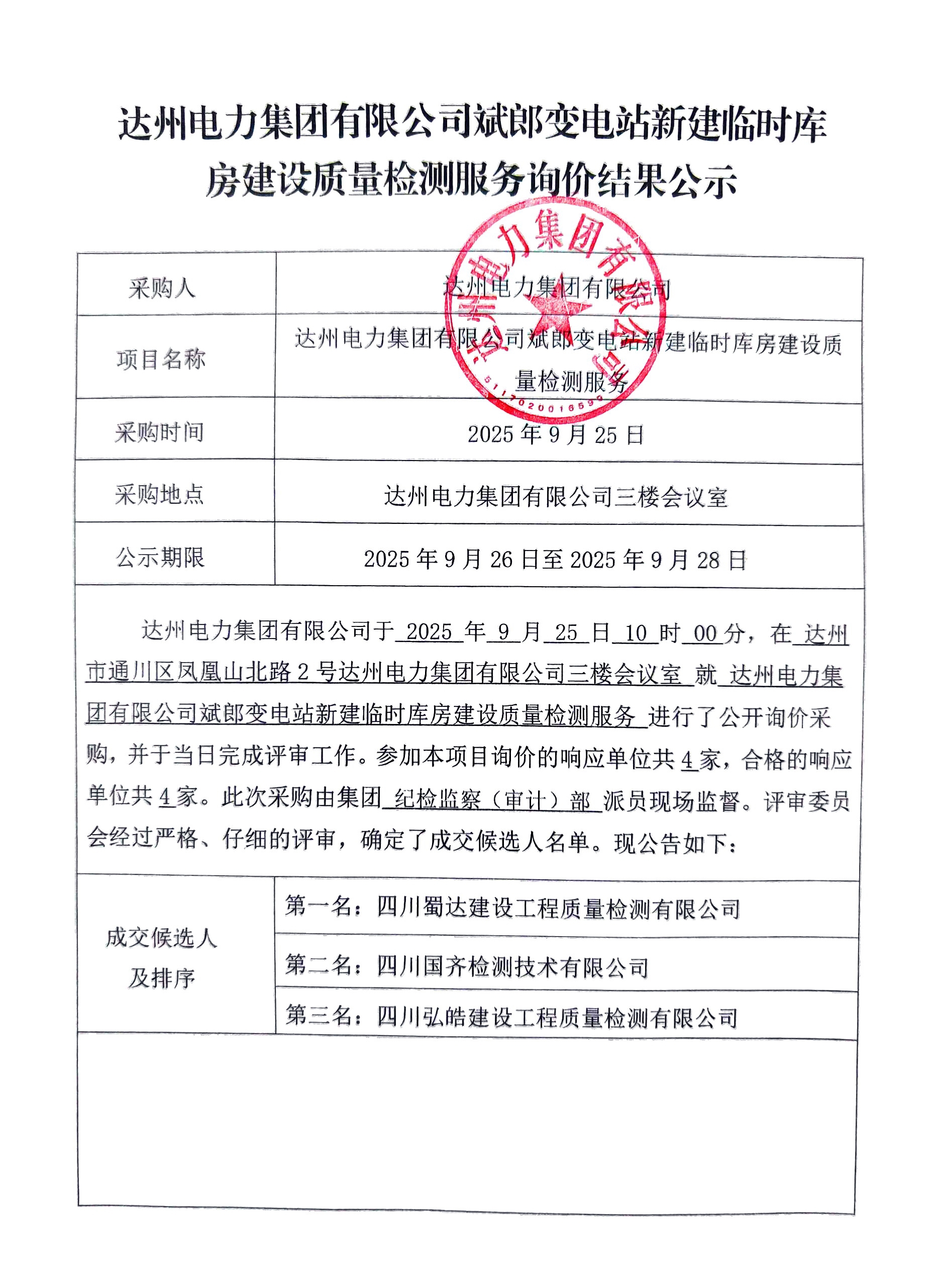 tapplay集团有限公司斌郎变电站新建临时库房建设质量检测服务询价结果公示