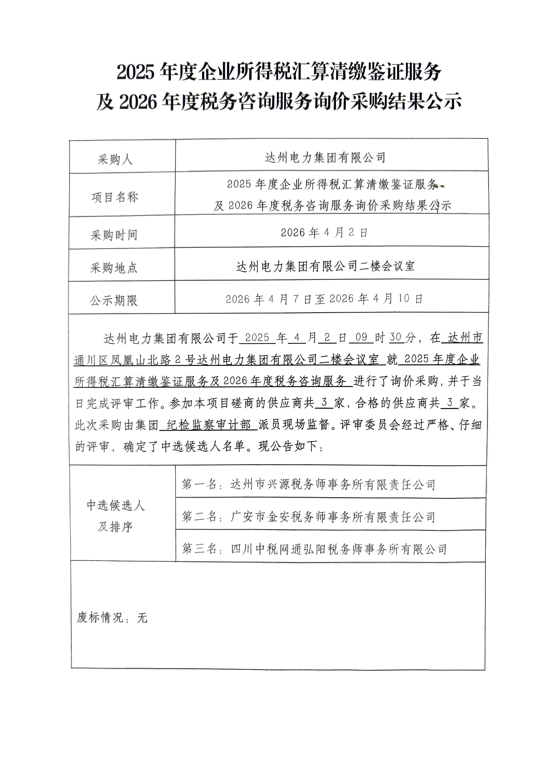 tapplay集团有限公司2025年度企业所得税汇算清缴鉴证服务及2026年度税务咨询服务询价采购结果公示